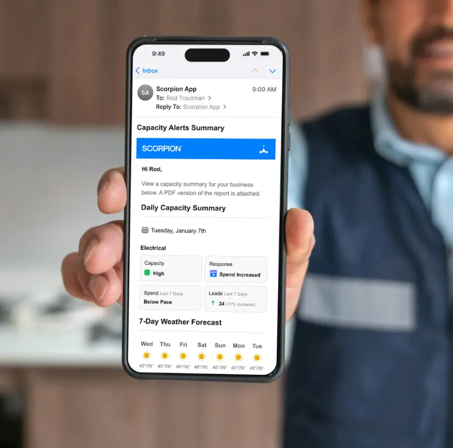 When your technicians have open appointments, your business isn’t making money. Scorpion's Capacity Marketing Engine automatically increases your advertising spend to efficiently fill those empty slots, even during seasonal fluctuations. - Dial it back.
