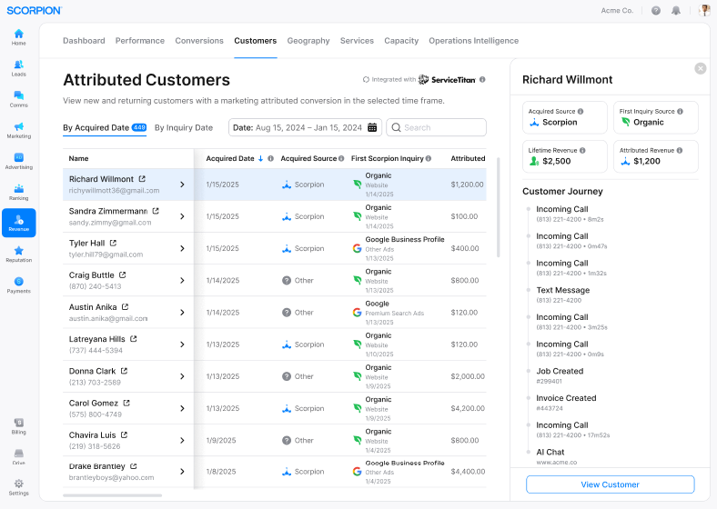 We’re introducing a powerful new way to track ROI in our Revenue Intelligence Reporting: the Attributed Customer Dashboard. Now clients can see the exact new and returning customers acquired through Scorpion marketing, along with their full revenue journey and the associated customer record in their CRM.