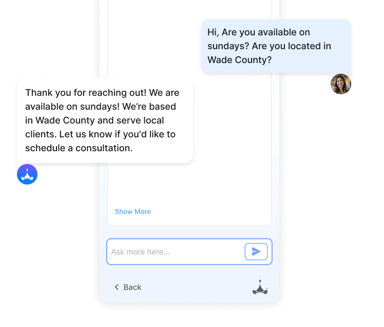 Your AI chat assistant never sleeps. Whether it’s lunchtime or midnight, your website visitors get the answers and help they need—encouraging them take action so you never miss a lead.