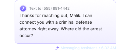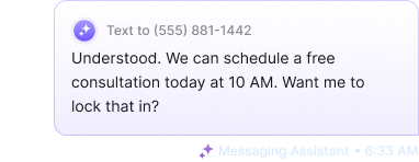 Messaging Assistant instantly responds to missed calls, texts, website chats, Facebook messages, LSA leads, and contact forms, 24/7.