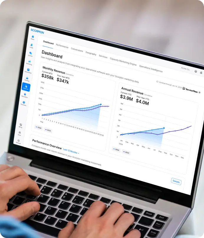 See how it all works together From Scorpion’s AI chat that responds 24/7, schedules appointments, and even accepts payments, to where your money is being allocated daily, you’ll see where and why every visitor turns into a closed job. And how we’re getting you more of them.