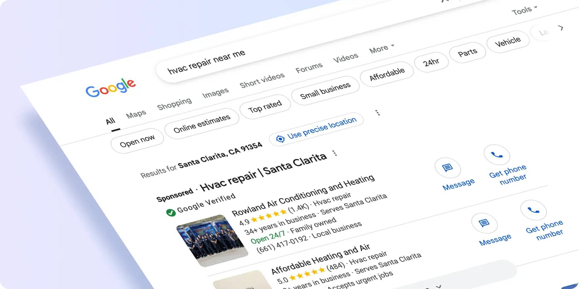 Google’s Local Services Ads (LSAs) appear at the very top of search results, above traditional PPC ads and organic listings. They operate on a pay-per-lead basis, meaning you only pay when a customer directly contacts you.